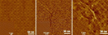 AFM images of CTAC micelles on (a) mica, (b) graphite, and (c) silica. The stripes correspond to micelle cylinders (hydrophilic mica and silica surfaces) and hemicylinders (graphite). Insets: the underlying atomic lattice of the respective substrates. [7]