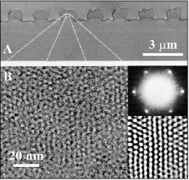 Electron microscopy of mesoscopic silica lines patterned onto a silica surface using an applied electric field and an elastomeric stamp. (a) SEM cross-section of the lines. (b) TEM image of the oriented channels. inset (top) small area electron diffraction image. (bottom) filtered image. [6]