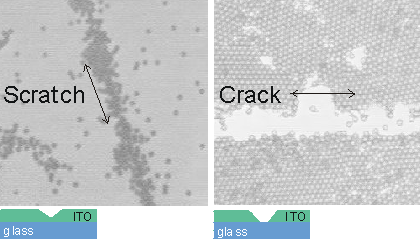 Optical microscope images of colloidal particles (2µm polystyrene) forming on an ITO coating on a glass substrate. (Left) A scratch that does not penetrate to the substrate encourages the preferential coagulation of particles at the scratch. (RIght) However, a penetrating crack prevents particle coagulation even under conditions favoring the formation of 2-dimensional crystalline layers of particles. (Micrographs courtesy of William Ristenpart)