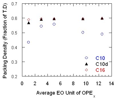 A closely-packed nonionic surfactant aggregate layer can form on top of hydrophobic silicon nitride surface pre-adsorbed with a cationic surfactant aggregate layer, even when the nonionic surfactant is not soluble in water. Only at high adsorption densities can these surfactant aggregate layers possess rupture force high enough to prevent particles from coming into hydrophobic contact. Under this circumstance, the silicon nitride particle suspensions have low viscosity and can be consolidated to high-density green bodies. Attraction between ethylene oxides chains of OPE surfactants, whose cloud points are below room temperature, is shown to have a significant contribution to the overall inter-particle force. It can possibly lead to weak attraction among particles which is considered to be essential for plasticity in the consolidated green bodies. High solid loadings are possible as shown in the following figure.