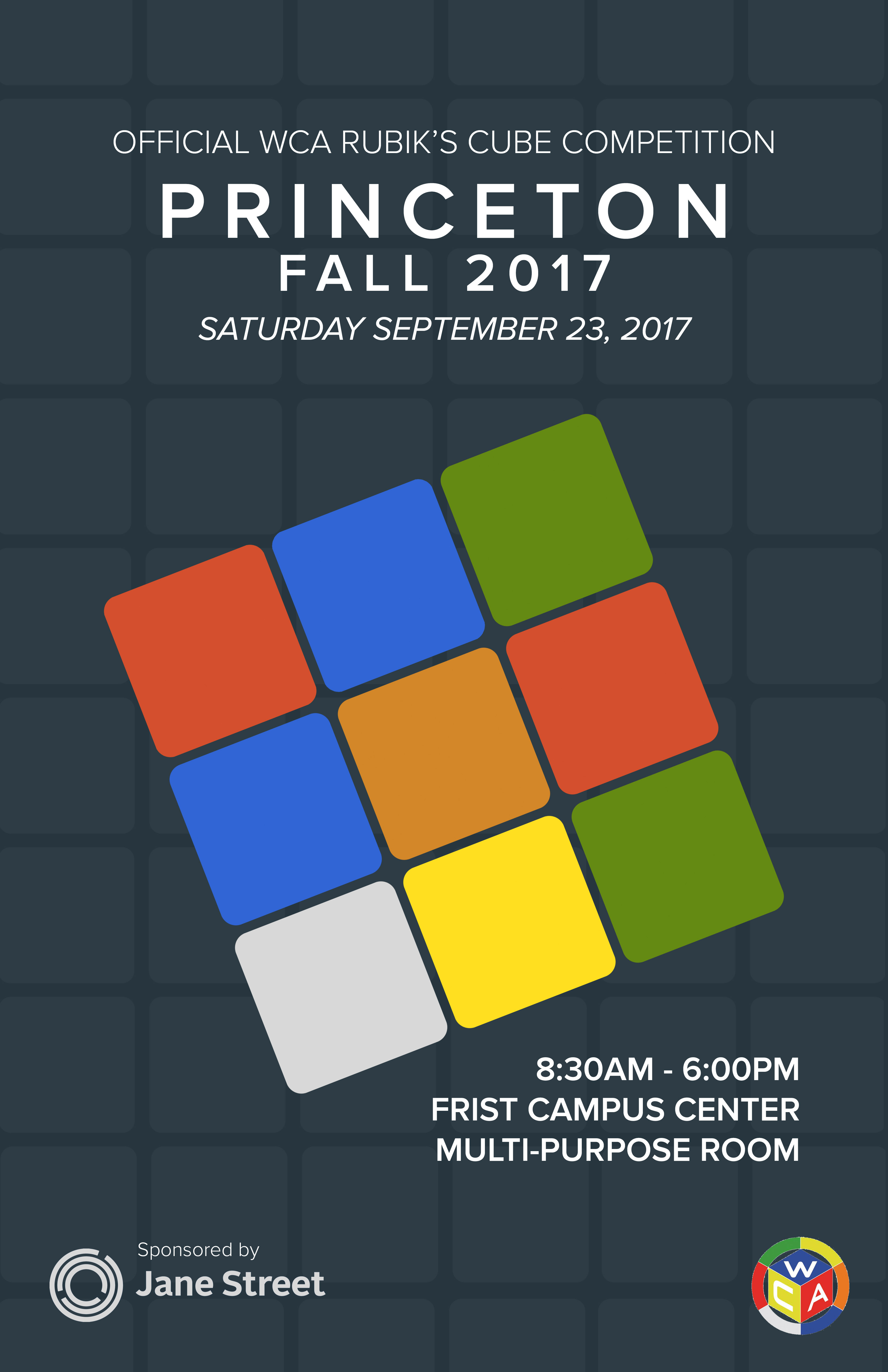 This was the first official WCA competition on Princeton campus. The following members from the Princeton Cube Club competed: Alan Chang (1st in Fewest Moves), Shotaro Makisumi (5th in 3x3 Speedsolve), Jennifer Tang, and Lillian Zhou. See the Competition page and finalized results for more information.