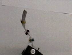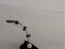 The ability to produce a mechanical fish has been limited by the ability to simply produce a traveling wave on a mechanical body. Tradition systems have consisted of complex hydraulic and pneumatic activation technology. A much simpler system consists of a flat plate, activated to produce Euler buckling modes. Activation of the first two modes are achieved via a system of cables. These two modes are shown in the images below. Individually these standing waves are inefficient thrust production devices, however if the modes are activated out of phase it is possible to produce a traveling wave on the membrane. The thruster has been mounted in a water channel for controlled investigation of the wake development and also under a boat to demonstrate the thrust production capability. Play the movies below. Future work will concentrate on variation of the membranes aspect ratio and the development of artificial muscles as activation components. The P-RAY will form the mechanical test bed to reveal and diagnose the complex behavior of the flow around a lamprey for example.![]()