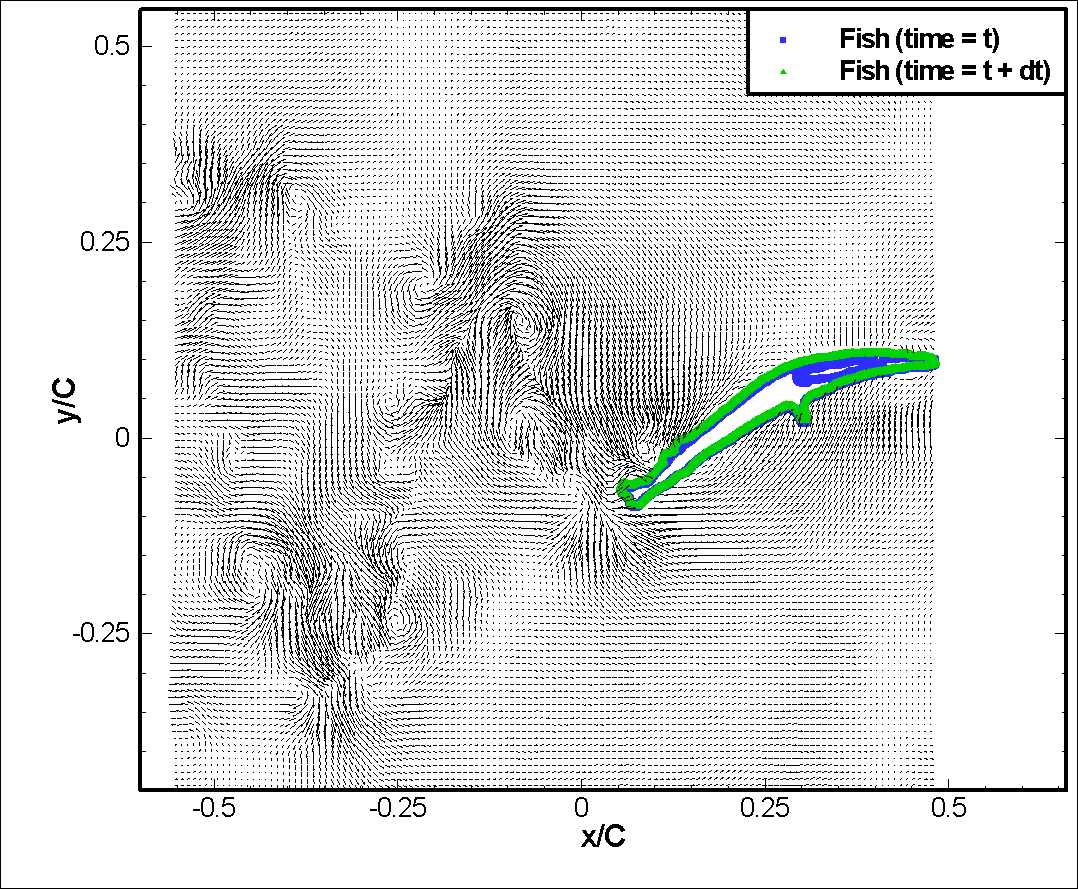 The following images show PIV (Particle Image Velocimetry) measurements of the wake of the mechanical fish.