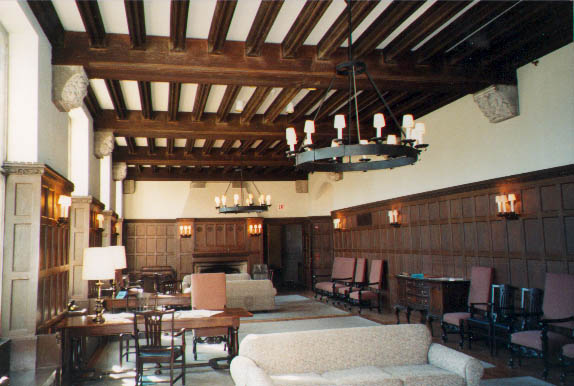 Among the public social spaces in the Graduate College, the Old Common Room is the most spacious. It is the setting for a weekly Social Hour, organized by the House Committee, casual bridge club meetings, and various receptions throughout the year. On weeknights, study groups often assemble here. ~ * ~ Above the windows on the south wall are stained glass armorial medallions executed by Connick that Dean West selected "as being most directly significant for the history of Princeton." Shown are the arms of Carteret and Berkeley, the royal proprietors of the colony; Sir Edmund Andros, Governor of New Jersey and other colonies; William Livingstone, first Governor of the State; and the arms of East Jersey, West Jersey, and New Jersey.
