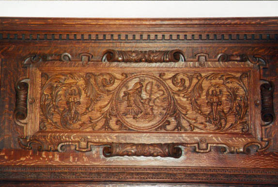 The wood carvings surrounding the fire place honor St. Thomas Aquinas and Aristotle as well as the Seven Liberal Arts, giving pride of place to the study of Grammar.