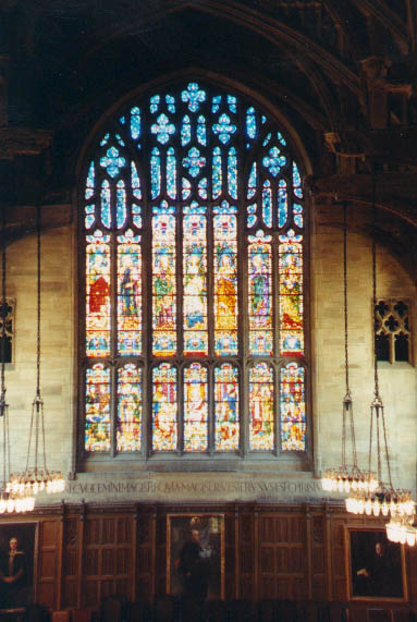 Probably the most admired part of Ralph Adams Cram's design for the Graduate College is Procter Hall, a grand dining hall clearly reminiscent of a medieval refectory. Upon entry into the hall, which seats 250, the awe-inspiring Seven Liberal Arts Window designed by William and Annie Lee Willet of Philadelphia takes center stage; it is best viewed between 2:30 and 4:30 p.m., depending on the time of year. The center row of images depicts the Liberal Arts, a designation that goes back to antiquity and forms the basis of the traditional medieval secular canon of learning. In today's terminology, "art" in this sense is more closely akin to a field of study. The quadrivium was concerned with study of the physical world: arithmetic, astronomy, geometry, and music (i.e. the mathematical theory of music). The trivium encompassed grammar, rhetoric, and logic (or dialectic). All liberal arts were subservient to philosophy, the supreme art. The Willets' design shows grammar, logic, and rhetoric in the center, flanked by arithmetic and geometry on the left, astronomy and music on the right.