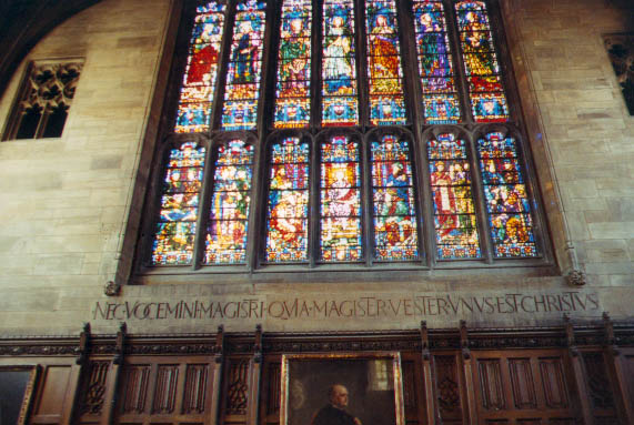 The bottom row of windows depicts "Christ, Teaching in the Temple" a choice that clearly indicates Dean West's Christian commitment and points to the pedigree of Western universities and colleges which, after all, emerged from monastic traditions. The motto West chose for the inscription underneath the great window makes this even more explicit: NEC VOCEMINI MAGISTRI QUIA MAGISTER VESTER UNUS EST CHRISTUS, or "And be ye not called master, for one is your master, even Christ." The window as a whole, then, shows the relation of the Christian tradition to the liberal arts, as Dean West envisioned it, a vision that is articulated with great rhetorical flourish by the artists in a 1918 pamphlet.
