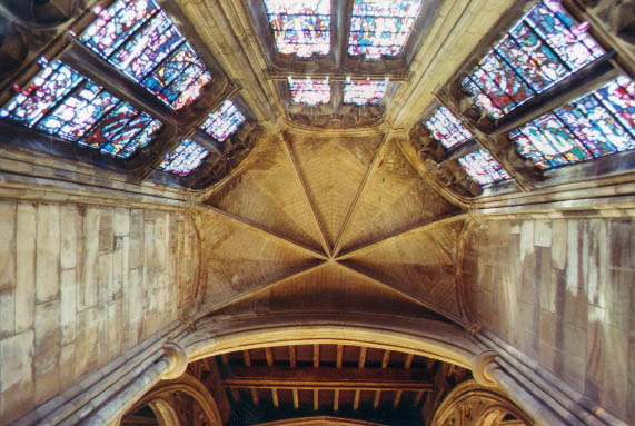 A view toward the vaulted ceiling in the oriel embellished with a Holy Grail stained glass window depicting scenes from Malory's Morte d' Arthur; it was designed by Charles Connick, one of Cram's favorite artisans.