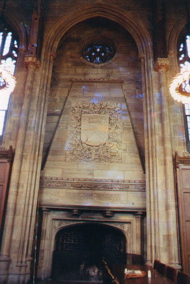 Opposite the oriel window is a massive fire place adorned with a relief showing the Princeton University shield superimposed on an oak tree. Among the leaves of the oak, the squirrels and birds at play are easily detected; the tiger hidden in the foliage requires closer observation. The inscription on the mantle is an exhortation to all who live and study at the Graduate College. It reads: "bonus intra, melior exi" - Enter Good, Leave Better.