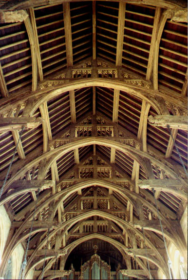 Next to the great window, the hammerhead beam construction of the ceiling is Procter Hall's most arresting feature. Tradition among generations of graduate students holds that the carved bosses on the hammerhead beams are humorous depictions of the trustees in Dean West's time. Each figure, wearing a mortarboard, holds an object in his hands that presumably symbolizes the primary source of his wealth: a railway car for Robert W. Garret, a laboratory beaker for Procter ... but there is no written evidence to support this interpretation.