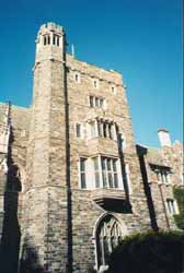 Between Procter Hall and the Old GC Common Room sits Pyne Tower, named for donor Moses Taylor Pyne. On the first floor of the tower lies a vestibule graced by a large fire place with four humorous depictions of scholars and the more somber Memorial Window. It commemorates six graduate students who lost their lives during the First World War. The bay windows on the second and third floor belong to Pyne Tower Suite, the apartment of the administrator in residence, formerly known as the Master's Suite. ~ * ~ With its southern exposure, the bay window in the living room lets in a beautiful warm light and offers a view of Springdale golf course and the GC volley ball field.