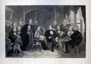 Washington Irving and His Literary Friends at Sunnyside, 1864. Steel line and stipple engraving. 56 x 78.5 cm. Engraving by Thomas Oldham Barlow (1824-1889), after a drawing by Felix Octavius Carr Darley (1822-1888), made from photographs by Mathew B. Brady (1823-1896), in conjunction with an oil painting by Christian Schussele (1824-1879).