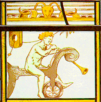 This church window in Stoke Poages, England, is one of the earliest (1637) representations of two wheeled - human powered transport. It has also been suggested that Leonardo da Vinci had the idea for this form of human-powered transportation. In terms of a practicable device the history starts in the late 1700's with the advent of the "Hobby Horse" in Paris in 1791. |