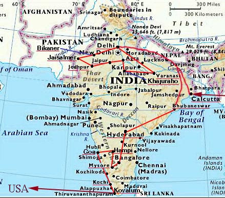 From December 17, 2000 until January 30, 2001, we traveled across India in the final segment of our family journey. Below are some representative photos from our last 6 weeks. We entered the country through Calcutta, traveled across the north and down to the south as you can see on this map.