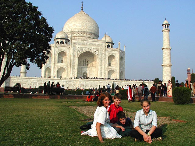 Here is the family in front of the Taj Mahal, the most beautiful building in the world, built as a memorial to the woman loved by a heartbroken king, over 400 years ago. Once again, a picture simply can't do justice to this amazing site. You can get a sense of its size by looking at the people on the platform in front of the building. How it can be so enormous and yet so delicate at the same time is a testament to those who designed and built it.