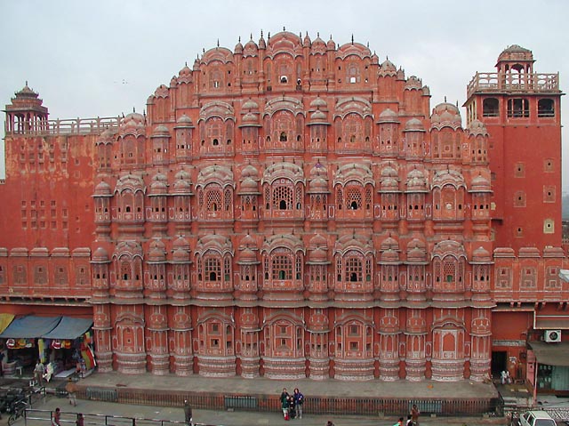 This is the Palace of Winds in the Orange City of Jaipur. The king of the region (called a maharajah) built this building for all the wives in his harem to watch the parades on the main street below. Each wife had a different assigned window. The family is at street level in the front.