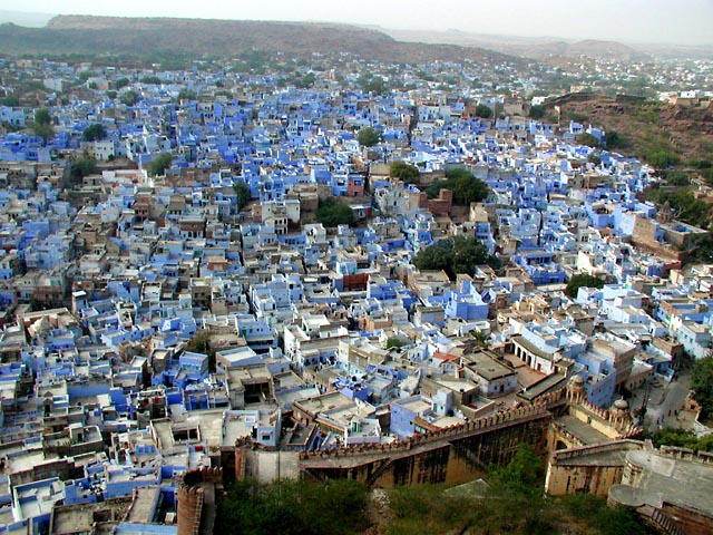 This is a view of Jodhpur, the Blue City, from the fort on the hill above. Hundreds of years ago, the residents of the city discovered that copper sulfate was a good deterrent against termites. Since that time, they have coated their walls with the mineral to protect their houses.