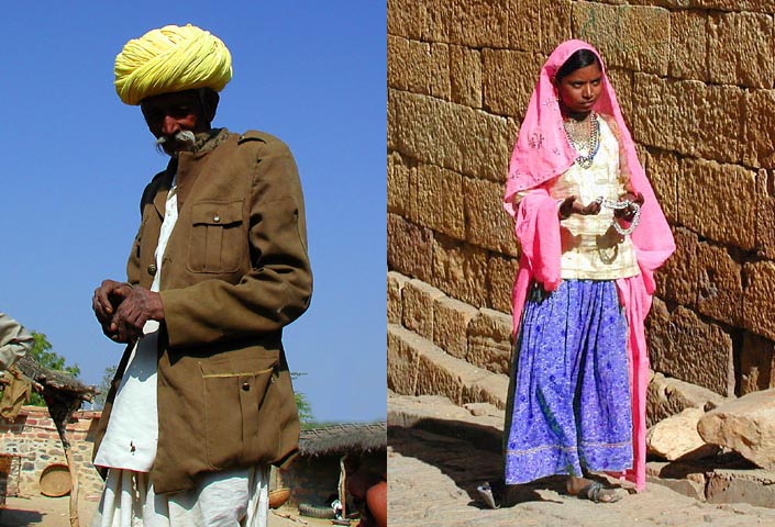 Some of the people we met at oasis's in the desert. The man is wearing a typical turban on his head. The woman, standing next to the wall of an ancient fort, is trying to sell us a necklace.