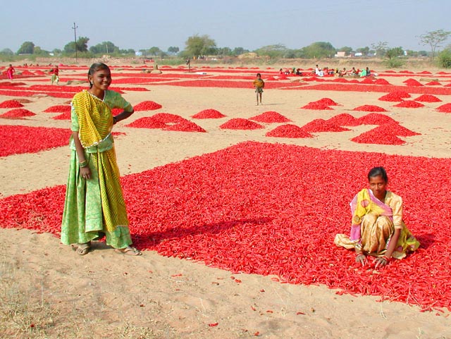 Red chili peppers are harvested at an oasis and laid out on the sand to dry