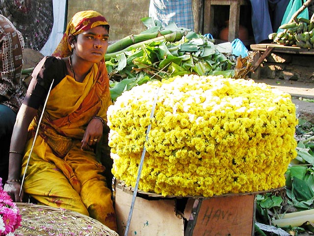 Calcutta is the last city in India that still has human-pulled rickshaws acting as taxis. The rickshaw "drivers' run down streets in their bare feet ferrying passengers from one place to another. Nearly all Indian women, of all classes, wear brightly colored saris.