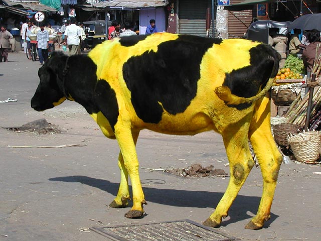 We traveled to the south of India. This photo was taken in the town of Mysore where the residents put yellow powder onto the white spots of all the holy cows (who wander the streets at their leisure).