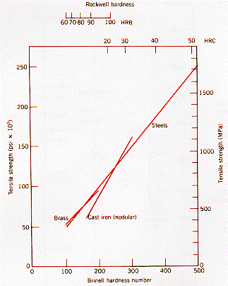 between the material hardness and the UTS for steel, brass, and cast iron. |