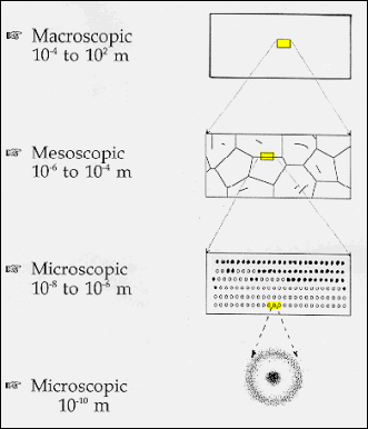 · The Structure of a material must be considered at different length scales · The diagram shows the range of normal interest, starting with the macroscopic continuum domain and extending to the level of single atoms · The control of materials at each of these levels will be important to their successful application |