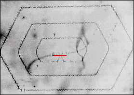 · The dislocation loops show the symmetry of the {111} slip plane. The dislocation line orientation in <110> directions gives the lowest loop energy. · The critical shear stress will be that stress that activates a Frank-Reed source and permits dislocation multiplication to occur. |