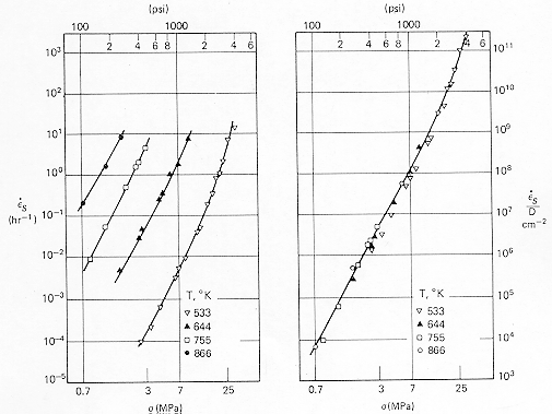 · Normalizing the creep rate by D(T), the temperature dependent self diffusion coefficient, collapses the data to a single curve. · For these plots of ln(dε/dt) vs. n Lnσ : 4 < n < 5 |