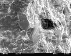 It shows both ductile and cleavage fracture surfaces as well as regions