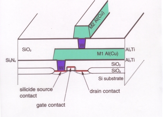 · The diagram shows an MOS device that employs silicon technology. The interconnections between the active components of the structure are an Al-Cu alloy, and tungsten studs are used to make connections between the layers of the six-layer structure. Device dimensions are at the 0.5 micron scale and layer thicknesses are on the order of a few hundred nanometers. |