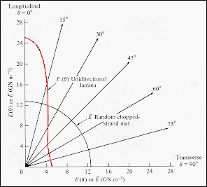 · The orientation dependence of the Young's modulus for a glass-fiber polyester resin composite with Vf = 0.30 is shown (red curve). For the system, Em = 3.5 GPa, Ef = 76 GPa, and Vm = 0.7. · The second curve (black) represents a composite with short, randomly oriented fibers. This material is isotropic in its elastic modulus. |