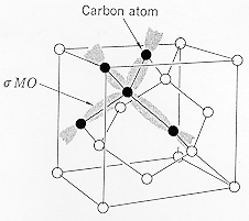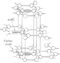 The electronic configuration of C is (1s)2(2s)2(2p)2, and the atomic radius is 0.0914 nm. The stable form of carbon at room temperature is Graphite which has a hexagonal crystal structure. (Top diagram) Diamond is metastable at room temperature and has a diamond cubic crystal structure. (Lower diagram) The diamond cubic structure is a face-centered-cubic lattice with a basis of two carbon atoms. |