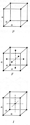 The Primitive cell (P) has fractional lattice points only at the cube corners, for a total of one lattice point per cell. The Face-centered-cubic cell (F) has fractional lattice points at the cube corners and at the center of each cube face for a total of four lattice points per cell. The Body-centered-cubic cell (I) has fractional lattice points at the cube corners and an additional lattice point at the cube center for a total of two lattice points per cell. |
