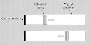 | The diagram illustrates a method for launching elastic waves using piezoelectric quartz transducers to produce the excitation, and then as detectors for the reflected elastic wave. The density discontinuity at the end of the sample is responsible for the reflection. The transit time for the elastic wave may be measured with high precision and the wave velocity can be accurately determined. The illustrated system is a good method for measuring the elastic constants of materials. | |||||||||