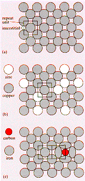 copper atom. In (c) the fcc form of iron, Austenite, is shown with an interstitial