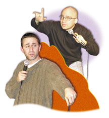 By Zach Pincus-Roth 02 Caption: Elliot Ratzman GS, top, and Brian Rosen 00 took the mike at a January stand-up comedy show on campus. (collage: steven veach)
