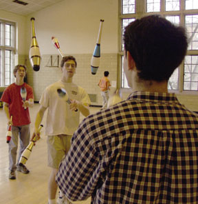 Up in the air By Matthew Winn 03 Geza Szigethy 04, Jacob Weiss 03, and Dave Sachs 02, officers of Princetons Juggling Club, practiced their moves in Dillon Gym in early March. Szigethy, who is from Bainbridge Island, Washington, and plans to major in chemistry, says, Why juggling? I have no idea. But he admits its a good way to relax. Weiss, a computer science major from Birmingham, Alabama, started juggling with his brother, Daniel 01, after they read a story about it in 3-2-1 Contact magazine when they were kids. According to all three, juggling quickly passes from quirky hobby into