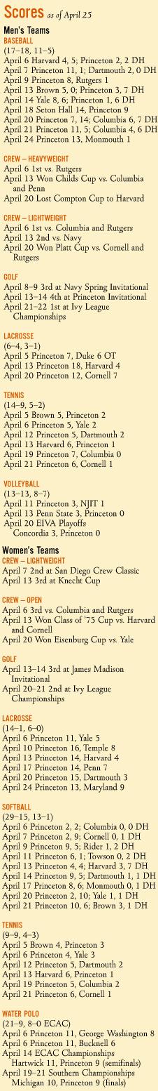 The mens lacrosse team kept its NCAA playoff hopes alive by knocking off fifth-ranked Cornell 127 at home on April 20. The Tigers scored five goals in a 4:16 span during the third quarter to break open a tight game. The win moved Princeton from eighth to fourth in the national polls and gave coach Bill Tierney the 200th win of his collegiate coaching career. Avery Kiser 05 won the individual title at the 2002 Ivy League womens golf championships with a three-round total of 226 at the Trenton Country Club on April 21. Princeton relinquished its Ivy title to Yale, finishing 17 strokes back with a team total of 980. Mens Heavyweight crews varsity 8 lost the Compton Cup to Harvard on April 20, its first loss of the season. The freshman 8 won its race in 6:04. Womens open crew took the Eisenburg Cup by beating Yale on April 20. Mens lightweight crew took the Platt Cup by beating Cornell and Rutgers on April 20. Equestrian team member Kelly Wells 04 will represent Princeton
