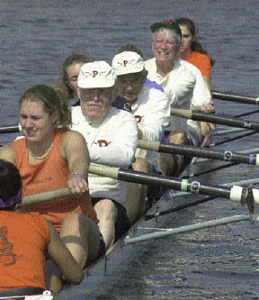 Pulling Together By Frank Wojciechowski The Class of 1947 held a 55th Reunion Row on Saturday, June 1, on Lake Carnegie, only the second class to put on such an event. (The first was the Class of 1943.) In honor of President Tilghman, the crew invited members of this years womens crew to join them. The rowers dedicated their efforts to the memory of their late classmate Bob Lorndale, who took part in their 50th Reunion Row, and to the Princetonians killed on September 11, who included Buff Wohlforth 76, son of their classmate Bob Wohlforth. The boat held, from left, Michelle Parris 04, Kim Taggart 04,