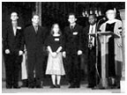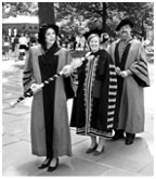 Photos: RIght: Shirley M. Tilghman with Faculty Marshals Sandra L. Bermann (comparative literature) and D. Vance Smith (English). Below: At Opening Exercises, Dean of the College Nancy Weiss Malkiel (right) recognized five undergraduates for exceptional academic achievement (left to right): Tudor Dan Dimofte 04, a native of Romania, majoring in mathematics; André Botelho Kurs 04, a native of Sao Paulo, Brazil, concentrating in physics; Mihai Manea 05, whose home town is Galati, Romania, planning to major in economics; Ruth Ilana Tennen 04, a resident of Connecticut, concentrating in molecular biology; and Dan-El Padilla 06, from New York City, who plans to major in classics. On September 7 the University officially began a new academic year at