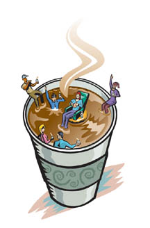 It is the most sought-after beverage at Princeton. Its legal, its stimulating, it has few calories, and its readily available, on campus and off. Coffee, latte, espresso, macchiato, decaf, cappuccino. . . . Its all good. And its sipped, swilled, stirred, and savored by the gallon. Measuring how much coffee is consumed on campus is not simple, but the numbers from a typical day at Café Vivian named for the wife of former Princeton president Harold Shapiro in the Frist Campus Center provide an idea. According to Matthew Smith, operations manager at Frist, the café serves 800 coffees each weekday. Thats 500 cups of American-style coffee, at $1.25 per cup, and 300 espresso-based coffees, together requiring 16 pounds of coffee. That means approximately 44 servings each hour the Café is open, from 7 a.m. to 2 a.m. Overall, more than 12,000 pounds of coffee are brewed annually on campus, according to Dave Goetz of the Office of Dining Services. That yields more than a half million cups of coffee, served in a variety of locations, including Café Vivian. Located on the middle floor of Frist Campus Center, Café Vivian the most frequented coffee bar at the University has some natural advantages: Its on the way to classes and is an easy place to meet friends, hang out, and study to the beat of African drum music or U2. Its also the only coffee shop that doesnt require money. Students happily charge coffee and pastries to their mom-and-dad-pay-at-the-end-of-the-semester prox cards. Other hangouts claim their regulars, too. Down Washington Road in the new Icahn Laboratory, chemical engineers, molecular biologists, and other scientists tank up with espressos and Sumatras from the Genomics Café, located in the middle of the soaring atrium designed by Rafael Viñoly. Lea Goentoro GS, a third-year chemical engineering student, buys at least two cups of coffee a day there, at $1.25 per cup: The Sumatra is really good, and when you need a change of environment, from the lab, you can come down here. Its more spacious, and its a place to meet fellow graduate students. Greg Reeves GS, a second-year chemical engineering student, agrees. While Reeves doesnt drink coffee, he does buy ice cream and says that the space encourages personal interaction. Its an interdisciplinary building, he says. The cheapest on-campus spot for coffee is at the Graduate College. At its coffee bar, 75-cent cups are dispensed from a thermos behind a counter arrayed with prepackaged snack crackers. But the bar is open only between 9 p.m. and midnight. On a recent night, the place was crowded with graduate students hunched over books, but most of them were not drinking coffee. Piper Harris GS, a first-year math student, was the only student with a coffee cup, and she had bought it at WaWa. This is really less of a coffee place because they open at 9 and they dont sell decaf, she says. Across the great divide of Nassau Street, coffee costs $1.45 at Bucks County Coffee in Palmer Square. Some Princetonians swear by the cafés drinks, local art, laptop-friendly electrical outlets, and chatty employees who dont seem to mind if students camp out and work for hours during midterms. Bucks seems to attract its faithful during the vulnerable residential-college years when students are just developing their coffee addictions, and its most loyal customers tend to hail from Rockefeller and Mathey Colleges, both just across Nassau Street. Nobelist John Nash *50 often comes here. One Bucks counterman said Nashs regular drink is a grande decaf skim mocha, but Nash, when asked to confirm his choice of beverage, elaborated, Its not really accurate; things like that are subject to constant changes. Not long ago I didnt know about the possibility of the dietetic mocha made with skimmed milk. Tomorrow it will be something else. On Nassau Street itself, students have an array of coffee hangouts to choose from, including Panera, a brightly lit and colorful chain sandwich shop and bakery. Students say Panera offers far more than just free samples of asiago cheese bread and You Choose Two meal combinations; it boasts coffees, teas, and basic variations of the cappa-frappa-mochacino drinks. Signs like Home is where the Hearty Grain is dont make Panera a popular date spot, but with its $1.29 bottomless cup of coffee, it has become a good study spot for in-the-know students. Those who can read amidst clanking plates and the smell of yeast bring headphones and work for hours on end. At Starbucks, just up the street, students know exactly what the coffee will be like. If one thing can be said for the ubiquitous Starbucks, its that it makes a predictably reliable cup of coffee for $1.45, and what it lacks in character mass-produced posters inspire with headlines such as Dreaming of a Unique Place and Follow the Herd it makes up for in convenience and tables just big enough for one or two calculus books. Starbucks has its faithful. It puts out a pretty solid espresso roast, says Seattle native Kelly Lisbakken 04. Its a consistent product. For serious caffeine stimulation, many swear by the independently owned Small World coffee shop, on Wither-spoon Street, with its Greenwich-Village-meets-grad-student-population atmosphere. Small World is the destination for students looking to discuss theses with professors, or undefined relationships with friends and lovers. The owners, young northern California refugees, serve a strong, dark, rich coffee theyve roasted themselves, for $1.30 a cup. Local art, available for purchase, hangs on the walls, employees wear shirts that say Fresh Music Served Daily, and café au lait comes in two separate glass carafes for customers to mix in just the right proportions. At times, clots of students and faculty push tables together, creating informal coffee klatches. President Tilghman stops in on her way to work for her usual double