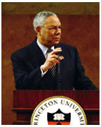 Secretary of State Colin Powell warned of the dangers of the proliferation of weapons of mass destruction and defended the Bush administrations actions in Iraq during a visit to campus February 20. Powell spoke about security and international relations in the post-September 11 world as part of a conference paying tribute to George F. Kennan 25, a major figure in Cold War foreign policy. In his keynote address, Powell promoted tough-minded diplomacy as the best tool to deal with nuclear weapons programs in North Korea, Iran, India, and Pakistan. He also said the absence of weapons stockpiles in Iraq does not get Saddam Husseins regime off the hook. They never lost the intention to have such weapons, he said. Powells address began with recollections of his own interaction with Kennan, who developed the United States containment doctrine. When Powell took office in 2001, Kennan wrote to him to offer practical advice. Powell thanked him and encouraged him to write again, to which Kennan replied, Im 97 years old. I do not intend to write you letters on a regular basis. Nevertheless, another letter arrived in Powells mailbox a few months later. Kennan, who turned 100 on February 16, was unable to attend Powells speech. Answering questions after his address, Powell, a retired four-star general