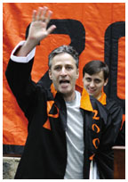 Class Day: Laughs for Stewart “There’s something we need to tell you about the real world,” said Class Day speaker Jon Stewart, comedian and host of The Daily Show. “I don’t know how to put this so I’ll be blunt. We broke it.” Stewart encouraged class members to repair the world and become “the next greatest generation.” A Hoagie Haven devotee and “townie” from nearby Lawrence Township, Stewart is the brother of alumnus Larry Leibowitz ’82. Stewart and his wife are expecting their first child in July; when asked whether his child might attend Princeton, Stewart said, “He’s tested poorly so far, but we’re crossing our fingers.”
