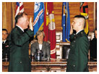 At the commissioning ceremony after Commencement, Col. (Ret.) William Torpey administers the Army oath of office to his son, 2nd. Lt. Kyle Torpey ’04. In back, from left, 1st Lt. Geoffrey Gasperini ’01, President Tilghman, and the Rev. Thomas Breidenthal look on. (Timothy Ross) Three hours after the Class of 2004 walked through FitzRandolph Gate June 1, nearly 200 friends and family members returned to Nassau Hall to see eight graduates take their first steps as commissioned officers in the Army, Air Force, and Marines. This year’s ceremony held added meaning as the University president presented the commissioning certificates for the first time in at least 15 years. The Reserve Officers Training Corps (R.O.T.C.) has both a proud tradition and a contentious past at Princeton, from the service of graduates in World War II and a peak enrollment of 1,100 cadets in 1951 through the banning and subsequent revival of the program in the early 1970s. By the 1990s, dwindling participation and a cap on scholarship funds threatened the future of Princeton’s Army R.O.T.C., the only remaining unit on campus. But the events of September 11, coupled with full-tuition scholarships and more flexible training hours, have generated stronger interest. The Classes of 2006 and 2007 each have 16 cadets. President Tilghman commended this year’s commissioning graduates, calling them a “true embodiment” of Princeton’s commitment to service. “It is precisely at a time like this that our nation is in greatest need of highly educated and highly motivated officers,” she said. First Lt. Geoffrey Gasperini ’01 added a real-world perspective to Tilghman’s words. Gasperini spent 11 months serving with the Third Army Cavalry Regiment in Iraq, patrolling the Saudi Arabian border region and the city of Fallujah, west of Baghdad. He spoke frankly about the failures of leadership in the Iraqi prisoner abuse cases and said today’s soldiers must “seek to influence by strength of character rather than strength of force.” The new officers swore the oath of office and stood at attention as their parents pinned the markings of rank onto their epaulets. They have taken different paths to military life. Five cadets, Andrew Nowak ’04, Karim Branford ’04, Martha Martir ’04, Nate Rawlings ’04, and Kyle Torpey ’04, trained in the Army R.O.T.C. Cory Jerch ’04 and Elizabeth Louis ’04 participated in the Air Force R.O.T.C. based at Rutgers University, and Jordan Stern ’04 joined the Marines with his sights set on becoming an aviator. With a four-year commitment to active duty, the graduates realize they