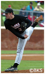 Pitcher Ross Ohlendorf ’05, right, allowed two runs and struck out six batters in 82/3 innings as Princeton upset host Virginia 4–2 in the opening round of the N.C.A.A. regional tournament at Charlottesville June 5. “I had never pitched over seven innings before in my life,”