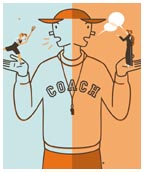 By Brett Tomlinson Illustrations: Leo Espinosa; Photographs: Beverly Schaefer Charles Goodwin ’93 played squash for four years at Princeton, honing his skills during hundreds of hours on the court and eventually serving as a team captain for the national champion Tigers in his senior season. But one of his most vivid memories comes from 1990, when he was a freshman. In Princeton’s annual meeting with arch-rival Penn, the Tigers and Quakers evenly split the first eight matches. The outcome hinged on the ninth and final match, in which Goodwin was struggling to find an edge against an older and more experienced competitor. With all eyes on Goodwin’s court, the game became more than just a test of rackets. The players expended every ounce of energy. Elation and frustration seesawed with each successive point. Calls were disputed and tension surfaced in a sport that relies on players to be their own referees. At one point, his competitor hit Goodwin with the ball — which Goodwin believes was “absolutely intentional.” Goodwin, however, maintained his focus, defeating his opponent and keeping his composure. “When you have someone challenging you, how do you respond?” Goodwin says of the match. “Do you want people to put an asterisk next to your win because you cheated?” The victory was one of his most rewarding Princeton experiences, says Goodwin, a former venture-capital executive who now works at IBM. For that, he credits his coach, Bob Callahan ’77, who from the first day of practice stressed integrity and fair play. Despite the high stakes of that match, Callahan did not use more seasoned players and decided to give Goodwin a chance to contribute. Challenges, after all, are part of life, even for 18-year-olds. “At some point, they’re going to be 40 years old and making some difficult decisions,” Callahan says, “and hopefully, they’ve had some practice in making the right decisions when things were a little stressful.” Student-athletes deal with obstacles and questions like the ones Goodwin faced on an almost-daily basis, both on and off the field of play, but finding the right answers is not a solitary pursuit. Coaches serve as motivators, supporters, critics, and guides along the way, forging bonds that often carry on beyond the four years student-athletes spend on campus. While the relationships coaches and players share have the potential to instill lasting values, that outcome is by no means guaranteed. According to Athletics Director Gary Walters ’67, education through athletics requires a conscious effort to instill commitment, integrity, ethics, and sportsmanship, an approach he calls “character-based coaching.”