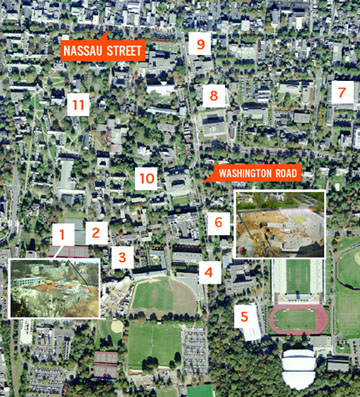 Construction projects on campus: a primer President Tilghman presented an update on campus planning to the Council of the Princeton University Community this spring, providing an overview of projects in progress and construction planned over the next five to 10 years. She also discussed the tension between adding new facilities, maintaining a pedestrian campus, and preserving Princeton’s open, park-like character. Several key construction and renovation sites are highlighted on this aerial photo, taken in October 2003. WHITMAN COLLEGE ( 1 ) , which will be one of the University’s four-year residential colleges, is scheduled to open in the fall of 2007. Constructed on the former site of the Pagoda tennis courts, the Demetri Porphyrios *80-designed complex will house about 500 undergraduates. Nearby BUTLER COLLEGE ( 3 ) is scheduled for major renovations in 2007 and 2008, and the University also hopes to build three single-family MASTERS’ HOUSES ( 2 ) for Whitman, Butler, and Wilson colleges on Elm Drive. A 200,000- to 250,000-square-foot CHEMISTRY BUILDING ( 5 ) will be built on the site of the old Armory, replacing the laboratories now housed at Frick Laboratory. The Armory location, near Icahn, Thomas, Schultz, and Moffett laboratories and Guyot, Jadwin, McDonnell, and Fine halls, fits the University’s plan to build “neighborhoods” of related academic departments. Said Tilghman: “Chemistry has fundamentally become a discipline whose intellectual spokes are reaching out to almost all of the other sciences.” Also situated in the sciences neighborhood is the LEWIS SCIENCE LIBRARY ( 6 ) , currently under construction and scheduled to be finished in 2007. The sweeping Frank Gehry design, said Tilghman, will be “a real architectural statement on one of the main thoroughfares on campus.” To tie the neighborhood of the sciences together, the University plans to build a PEDESTRIAN FOOTBRIDGE ( 4 ) over Washington Road. Designed by architect Christian Menn, whose best-known creation in the United States is the Bunker Hill Memorial Bridge in Boston, the structure will serve as a gateway to campus, Tilghman said. With the ENGINEERING QUADRANGLE ( 7 ) “bursting at the seams,” Tilghman said the School of Engineering and Applied Sciences is due to add laboratory space. Plans may include building a separate home for operations research and financial engineering, expanding the E-Quad, and improving existing facilities. FRICK LABORATORY ( 8