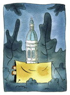 Into the wilderness By Amy Sennett ’06 A man in black spandex streaked across the floor of Dillon Gymnasium. The human wave swept through the room as a knight with a tinfoil hat drew her sword in defense of a gentleman in a pink prom dress. A chant rose up from the crowd: “We want freshmen!” This circus-like atmosphere on the Saturday before Labor Day was the first taste of life at Princeton for members of the Class of 2009 in this year’s Outdoor Action freshman orientation program. On top of the typical fears about undergraduate life, these new collegians must deal with blisters, bug bites, and no showers for a week. Outdoor Action, known simply as OA, sends groups of freshmen into the wilderness with upperclass leaders — the bizarre cast of characters in the gym — for six days of backpacking, climbing, or canoeing. This year, 561 freshmen, 45 percent of the incoming class, participated in 66 trips to places ranging from the Green Mountains of Vermont to the Shenandoah Valley of Virginia. The operation requires 6,210 packets of instant oatmeal, 1,640 pounds of gorp (good old raisins and peanuts), and a summer-long effort by Outdoor Action director Rick Curtis ’79 and his team of student coordinators, all with the goal of easing the transition to college life. As a “frosh” on a Saturday three Septembers ago, I badly desired acceptance from the sea of unfamiliar faces in the gym, and I shed more than a few tears of loneliness when I called my parents that night. Now, as a leader, that Saturday holds for me the thrill of knowing that I am about to powerfully affect someone’s Princeton experience. How do other leaders remember their response to the madness inside the gym? “Intimidated and nervous” is how veteran leader Brady Walkinshaw ’06 described himself as a freshman. “But the atmosphere leaders create on trips is a fusion of very welcoming and effusive excitement. That’s what integrates you into the group.” Indeed, somewhere along the trail, the anxiety begins to melt away. Freshmen realize that they share many of the same concerns. Leaders address questions on everything from academics to eating clubs, sharing wisdom gained in their time on campus. “They talked about the way things worked and filled us in on the details of Princeton life that no one knows ahead of time,” Thomas Curry ’08 said of his leaders. Curtis proudly noted that a survey of freshmen at Princeton and Harvard, which runs a similar program, found that students who participated in wilderness orientation trips reported a better social fit on campus than those who did not. “You have this network of friends, and Princeton starts to exist for you and people you know,” said Curry of his return to campus after OA. “You feel more a part of a place you haven’t experienced yet.” [A senior Outdoor Action leader was airlifted to a Philadelphia hospital for treatment of injuries suffered on a trip he was leading. See In Brief, page 14.] ... For members of the Class of 2006, the anticipation of reuniting with friends in a familiar place has replaced the nervousness they felt at the doors of Dillon Gym three years ago. But that’s tempered by the strain of theses looming overhead and the recognition that this is their last year at Princeton. “It was sad to think that this was the last room I would have on campus,” said David Graber ’06. “Especially as a senior, I know there are so many things available that I never had the time for or never took advantage of.” “I’m trying to remember that I need to really enjoy this year, and not let it blaze by me,” said Nicole Larrea ’06. Larrea, a psychology premed student studying moral reasoning, said that hearing from other seniors who have begun their research has her excited to start her own thesis. At least for the first few weeks of the semester, however, thesis plans will have to take a backseat to the enjoyment of Indian summer, fall lawn parties, and football tailgates. “I’m in denial about how much work I have to do and in denial about facing the real world,” said Emily Lammers ’06. “I’m going to enjoy it for a few more weeks and just have fun. This is the last fall I’ll really look forward to — coming back to the perfect autumn days, the whole collegiate atmosphere. “I’m really jealous of the freshmen,” Lammers added.