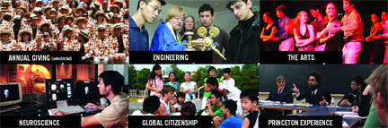Annual Giving: $250 million • Includes five years of Annual Giving, so that each class will have a major reunion during the campaign. • Unrestricted funds flow directly to the University’s operating budget. Engineering, energy, and the environment: $325 million • Construction of a 40,000-square-foot building for Operations Research and Financial Engineering, and a new 110,000-square-foot research laboratory building. • About 20 new faculty members, with emphasis on the areas of alternative energy, information-technology policy, health-related research, and environmental remediation. The goal: “Princeton will become the leading institution in the world for solving the complex global problems caused by burning fossil fuels.” • Courses that offer non-engineers a better understanding of technology, and that offer engineers a broader focus for engineering projects. Exploration in the arts: $325 million • Construction of the “arts neighborhood,” a cluster of facilities south of McCarter Theatre, to house new and expanded programs in music performance, visual arts, creative writing, theater, and dance. • Additional collection and exhibition space for the University Art Museum. • New faculty, distinguished visiting critics and artists, and an interdisciplinary Society of Fellows in the Arts for innovative, early-career artists. • Support for the Princeton Atelier, which brings guest artists to campus for collaborative efforts with faculty and students. Neuroscience, genomics, and theoretical physics: $300 million • New buildings, to be located south of Icahn Laboratory, that will house the psychology department and the Institute for Neuroscience, connected by shared space. • Adding about nine professors to the core neuroscience faculty. • Expanding the faculty associated with the genomics institute, and creating a postdoctoral fellows program in theoretical physics. National and global citizenship: $300 million • Funds for language studies and to expand study-abroad programs. • International collaborations, including the Global Scholars program that will bring scholars to campus from other countries. • Support for programs in international and regional studies. • Expansion of faculty and programs in the Center for African American Studies. The Princeton experience: $250 million • Constructing a new four-year college on the site of the demolished Butler College buildings, a dorm for independent juniors and seniors, and a college master’s residence. • Support for a broad array of student organizations, health services, varsity athletics (including endowed coaching positions), and club sports. • Funds for undergraduate scholarships and graduate fellowships. • Endowed professorships and preceptorships, and funds for freshman